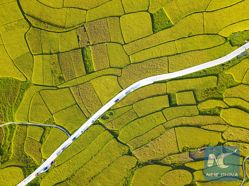 Photo taken on Sept. 24, 2017 shows paddy fields in Gaopo Township in Huaxi District of Guiyang City, southwest China's Guizhou Province. As autumn comes, Guizhou Province is about to enter its rice harvest season. (Xinhua/Wu Dongjun)