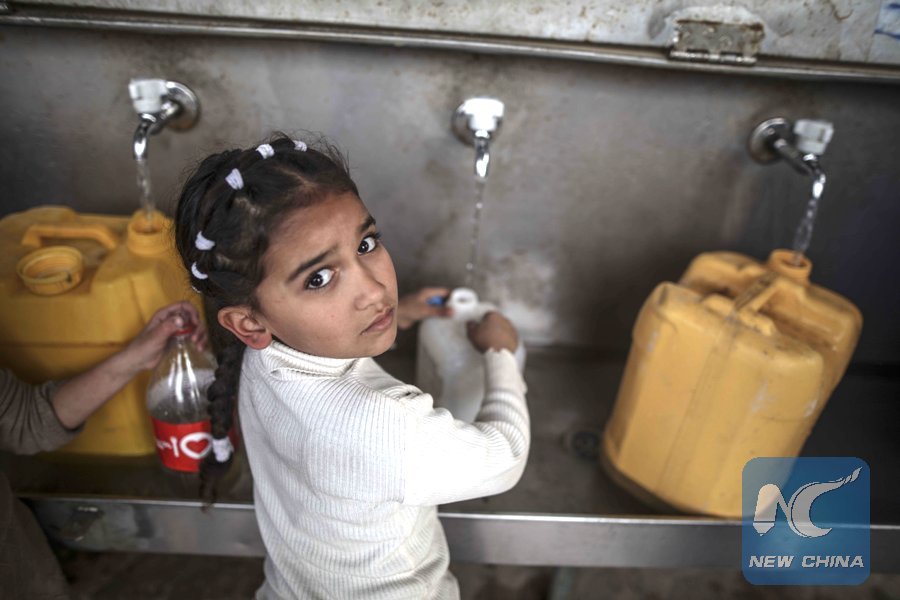 A Palestinian girl fills bottles with drinking water from public taps at the al-Nusirat refugee camp in the Gaza strip, on Feb. 10, 2018. (Xinhua/Wissam Nassar)