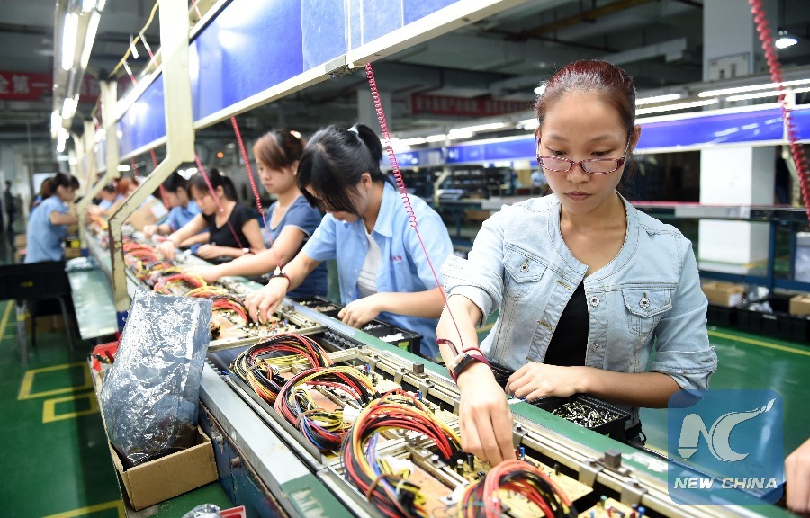 Staffs work along the production line in an electronic manufacture factory in the industrial park of Beihai city, southwest China's Guangxi Zhuang Autonomous Region, Oct. 19, 2015. (Xinhua/Lu Boan)
