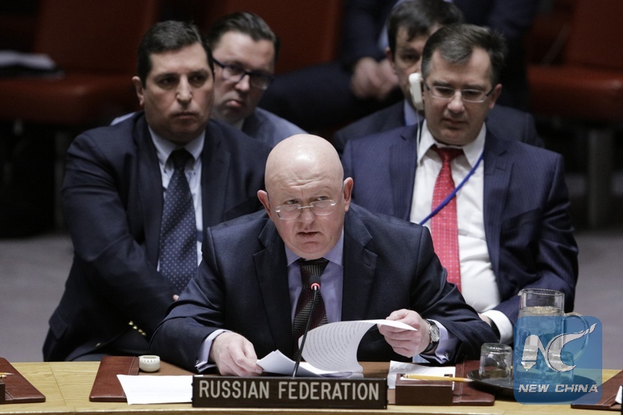File Photo: Russian Ambassador to the United Nations Vassily Nebenzia (Front) addresses a Security Council emergency meeting regarding accusations of the use of a nerve agent in the United Kingdom at the United Nations headquarters in New York, on March 14, 2018. (Xinhua/Li Muzi)
