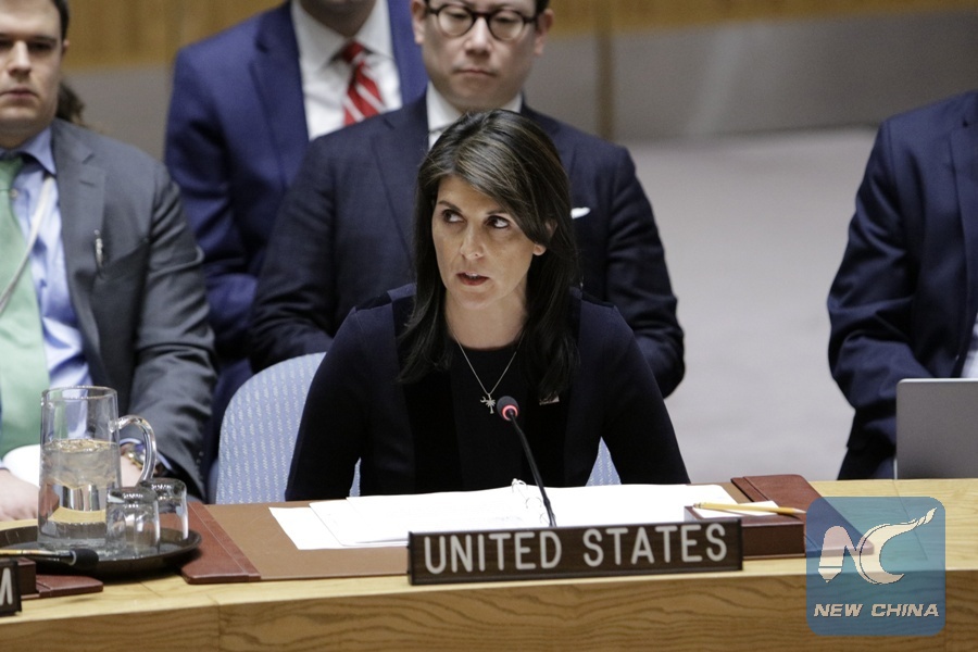 U.S. Ambassador to the United Nations Nikki Haley (Front) addresses a Security Council emergency meeting regarding accusations of the use of a nerve agent in the United Kingdom at the United Nations headquarters in New York, on March 14, 2018. (Xinhua/Li Muzi)