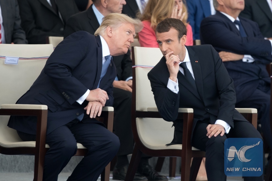 U.S. President Donald Trump (L) talks with French President Emmanuel Macron (R) during the annual Bastille Day military parade on the Concorde Square in Paris, France on July 14, 2017. (Xinhua/Jack Chan)