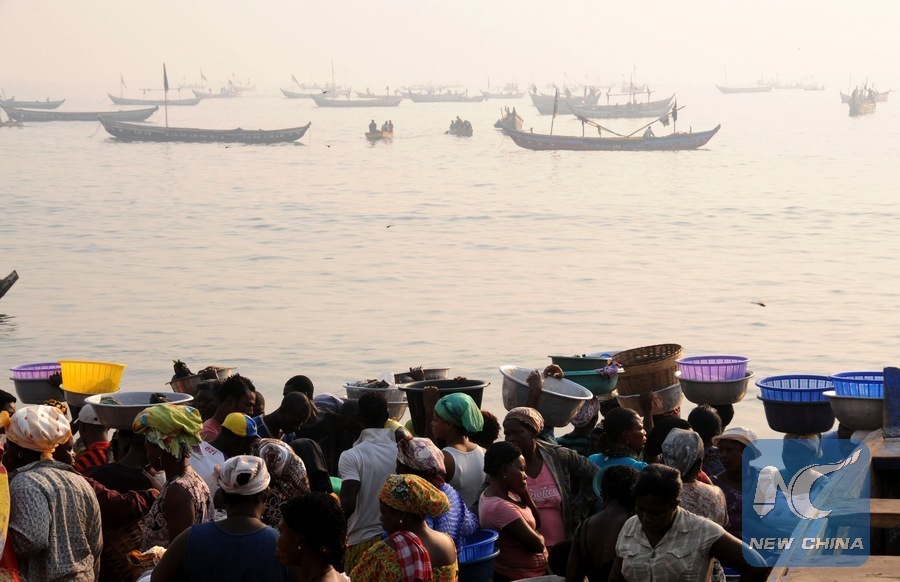 File photo shows fishmen and vendors wait for boats with sea products at the fishing port of Jamestown in Accra, capital of Ghana. (Xinhua/Shao Haijun)