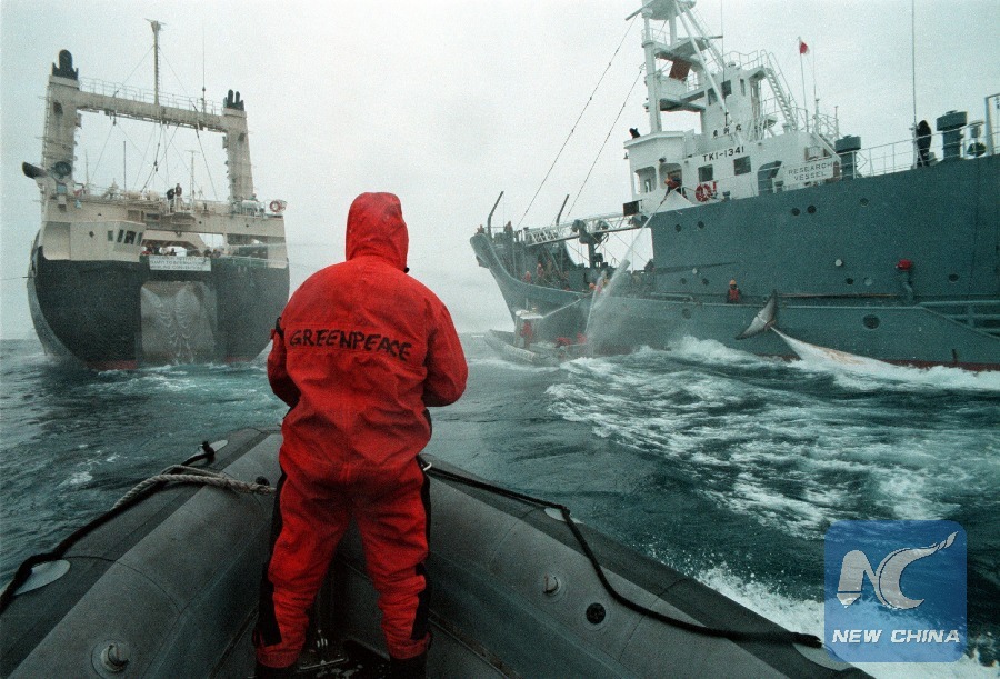 Photo taken on Dec. 1, 2000 and provided by international environmental organization Greenpeace shows Greenpeace activists trying to stop whaling by Japanese in the Southern Ocean. (Xinhua/Cunningham)
