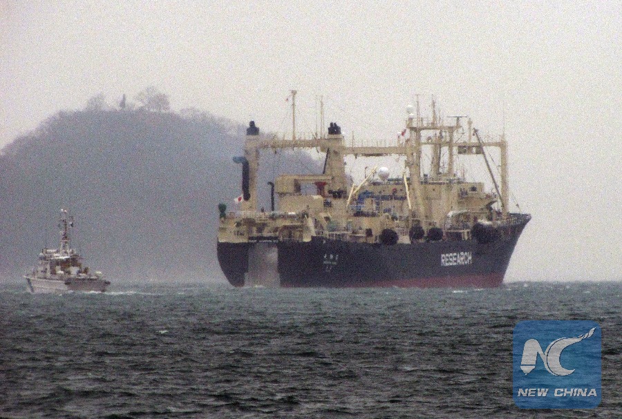 This picture shows Japan's whaling research ship 'Nisshin Maru' leaving from a port of Innoshima island in Hiroshima prefecture, western Japan to Southern Japan on December 28, 2012. (Xinhua/AFP)