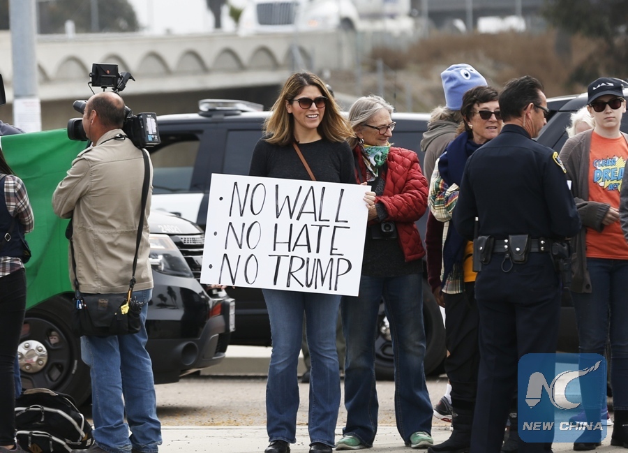 A woman protests near the border wall prototypes in San Diego, the United States, on March 13, 2018. U.S. President Donald Trump on Tuesday inspected prototypes for his long-promised wall along the border with Mexico in a tour that drew both supporters and protesters. (Xinhua/Li Ying)