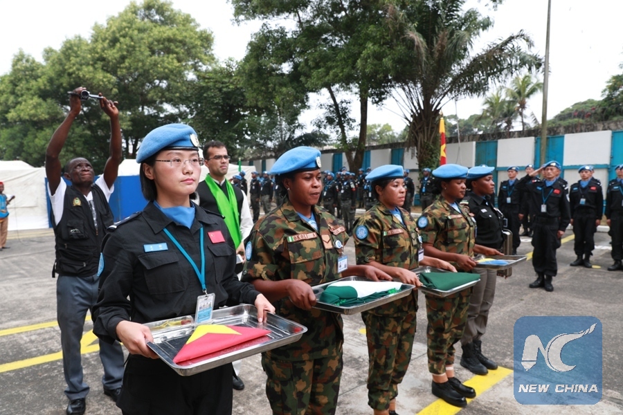 Members of peacekeeping troops attend a sent-forth event in Monrovia, Liberia, on Feb. 5, 2018. (Xinhua/Zhao Xiaoxin)