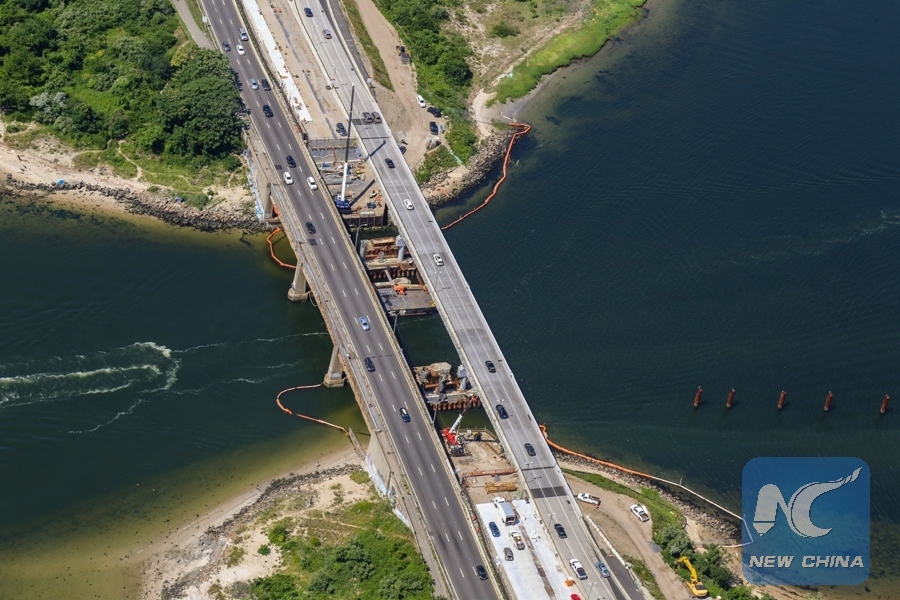 Photo taken on July 19, 2016 shows the construction site of the rehabilitating project of Gerritsen Inlet Bridge carried out by China Construction America in New York, the United States. (Xinhua/China Construction America)
