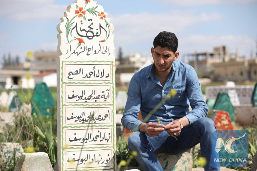 Abdulhamid Yusuf, who lost 19 members of his family, including his wife and two children, visits the graves of his relatives in Syria's Khan Shaykhun town on March 31, 2018. On his wedding anniversary this year, the 29-year-old Syrian widower will have nothing to remember but a suspected chemical attack that killed his wife and two small children. (Xinhua/AFP )