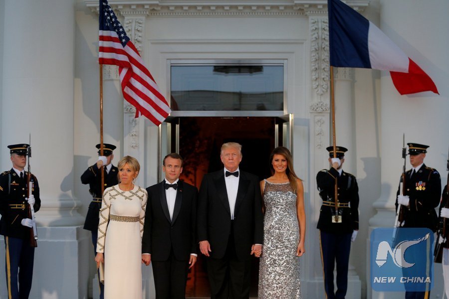 U.S. President Donald Trump and first lady Melania Trump welcome French President Emmanuel Macron and his wife Brigitte for a State Dinner at the White House in Washington, U.S., April 24, 2018. (Xinhua/REUTERS)