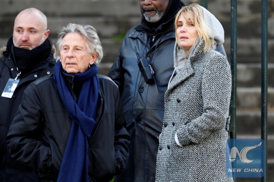 Film director Roman Polanski and Emmanuelle Seigner arrive at the Madeleine Church to attend a ceremony during a 'popular tribute' to late French singer and actor Johnny Hallyday in Paris, France, Dec. 9, 2017. (Xinhua/REUTERS)