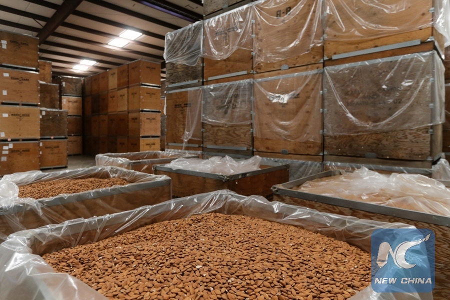 Almonds are seen in shipping containers in a warehouse at Capay Canyon Ranch in Esparto, California, U.S. April 2, 2018. (Xinhua/REUTERS)