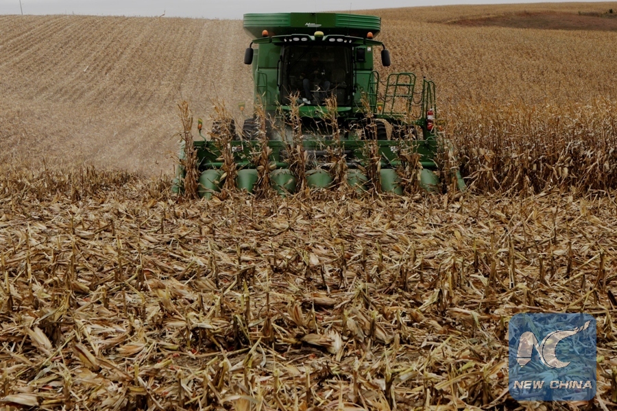 A farmer drives a combine as he harvests corn on his farm near Dixon, Nebraska, U.S., October 26, 2017. (Xinhua/REUTERS)