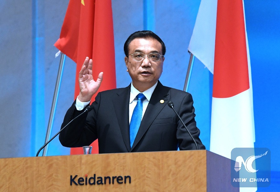 Chinese Premier Li Keqiang delivers a speech while attending a business summit of China, Japan and South Korea along with Japanese Prime Minister Shinzo Abe and South Korean President Moon Jae-in in Tokyo, Japan, May 9, 2018. (Xinhua/Rao Aimin)