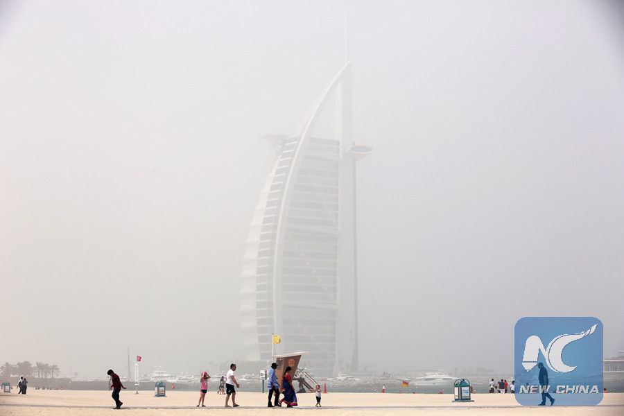 Photo taken on May 10, 2018 shows the hotel Burj Al-Arab in Dubai, United Arab Emirates (UAE). A sandstorm hit Dubai and some other emirates on May 10, 2018. (Xinhua/Mahmoud Khaled)