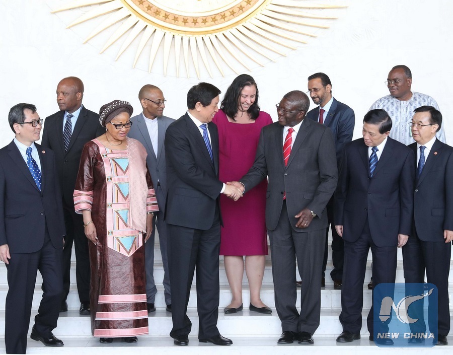 Li Zhanshu (3rd L, front), chairman of the Standing Committee of China's National People's Congress (NPC), meets with Thomas Kwesi Quartey (3rd R, front), Deputy Chairperson of the African Union (AU) Commission, during his visit to the AU headquarters in Addis Ababa, Ethiopia, on May 11, 2018. (Xinhua/Liu Weibing)