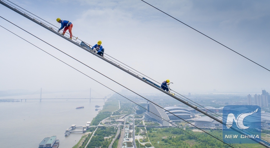 Workers install wire netting upon catwalk for the construction of a bridge across the Yangtze River in Wuhan, capital of central China's Hubei Province, May 8, 2018. (Xinhua/Ke Hao)