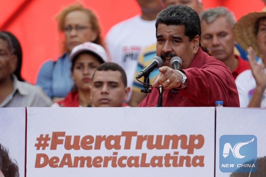 Venezuela's President Nicolas Maduro gives a speech in front of a sign, which reads: "Trump go away from Latin America," at a rally against U.S. President Donald Trump in Caracas, Venezuela, Aug. 14, 2017. (Xinhua/REUTERS)