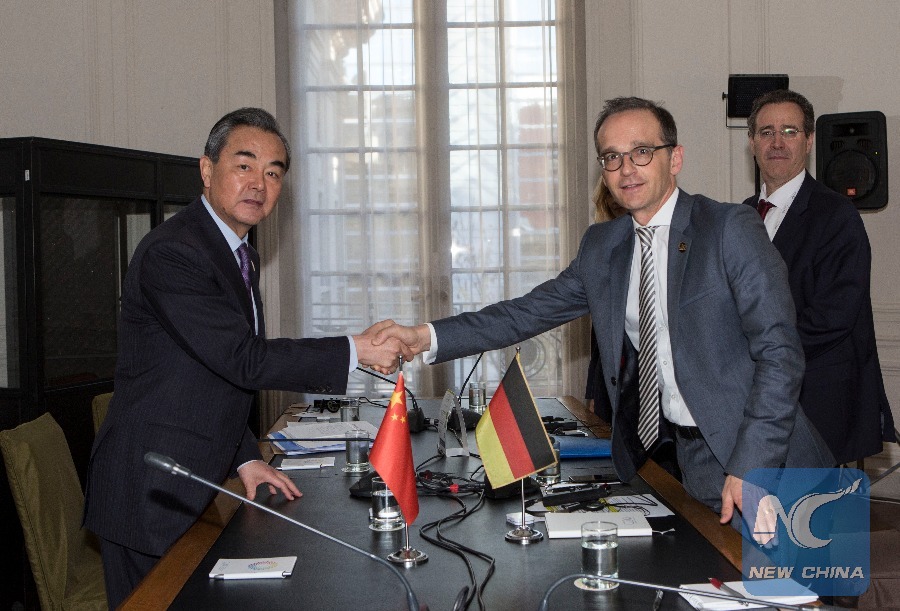 Chinese State Councilor and Foreign Minister Wang Yi (L) meets with German Foreign Minister Heiko Maas in Buenos Aires, Argentina, May 21, 2018, on the sidelines of the G20 foreign ministers' meeting. (Xinhua/Martin Zabala)