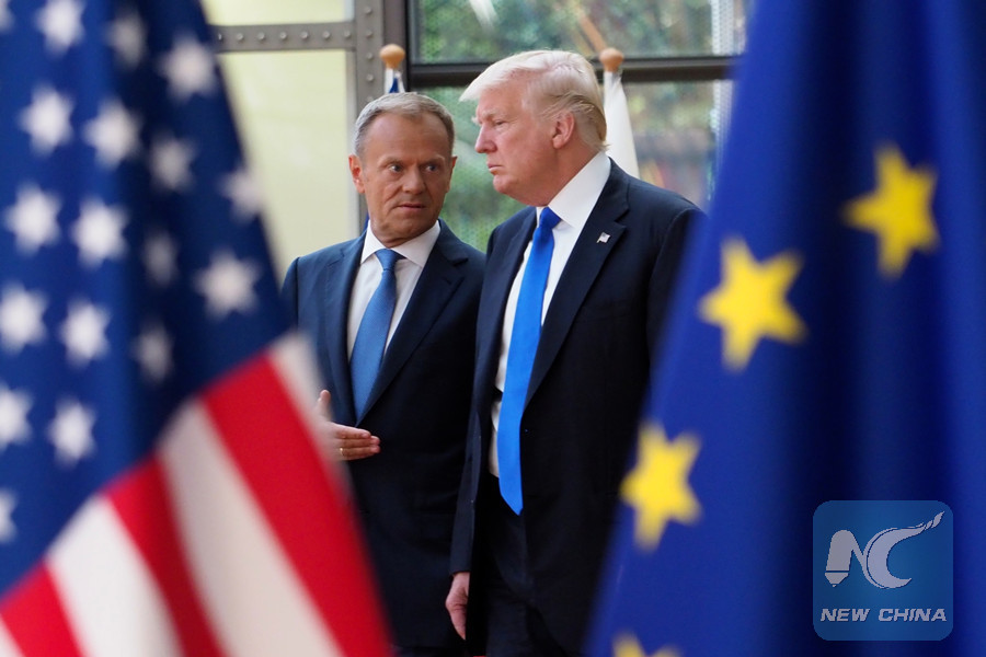 U.S. President Donald Trump (R) talks with European Council President Donald Tusk prior to the EU-USA Leaders' Meeting at the European Council headquarters, in Brussels, Belgium, May 25, 2017. (Xinhua/Thierry Monasse)