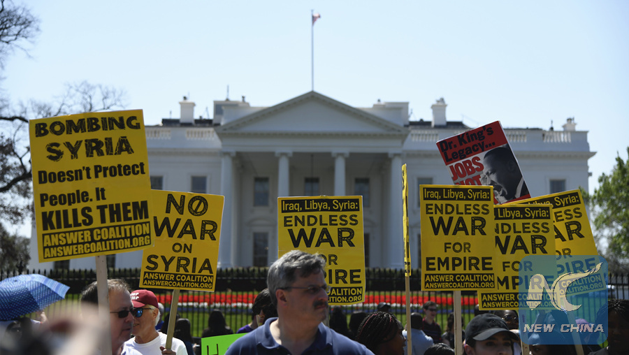 People protest against U.S. strike on Syria outside the White House in Washington D.C., the United States, on April 14, 2018. (Xinhua/Yang Chenglin)