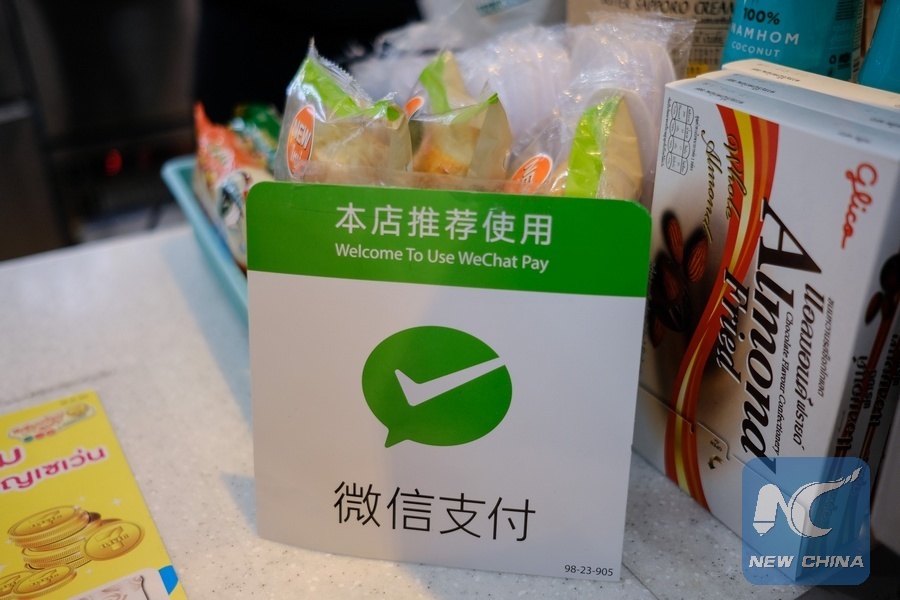 A plate of "Wechat Pay" is shown at the counter of a store in Bangkok, Thailand, May 5, 2017. It is a common thing in China to take no cash and pay with a smartphone, which is installed with China's Alipay or Wechat apps. With a smartphone, people can pay almost everything such as shopping, repairing car, paying a taxi and registering a hospital. In many other countries, payment with Alipay and Wechat is becoming a new trend. Alipay's parent company, Ant Financial Services Group or "Ant Financial," has more than 200 million users in 25 countries and regions. Wechat, China's largest social media company, has also grabbed dozens of markets around the world. (Xinhua/Li Mangmang)