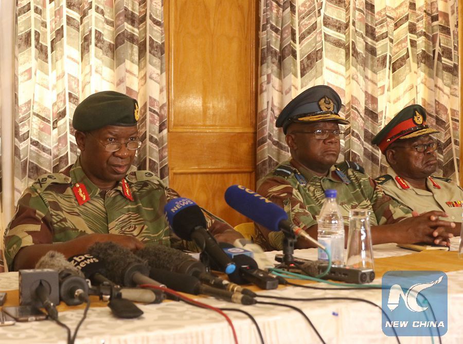 Zimbabwe National Army Commander Lieutenant-General Philip Valerio Sibanda (L) addresses the press in Harare, capital of Zimbabwe, Dec. 18, 2017. The Zimbabwe Defense Forces (ZDF) on Monday announced the end of their military intervention that culminated in the resignation of former Zimbabwean President Robert Mugabe in November. (Xinhua/Shaun Jusa)