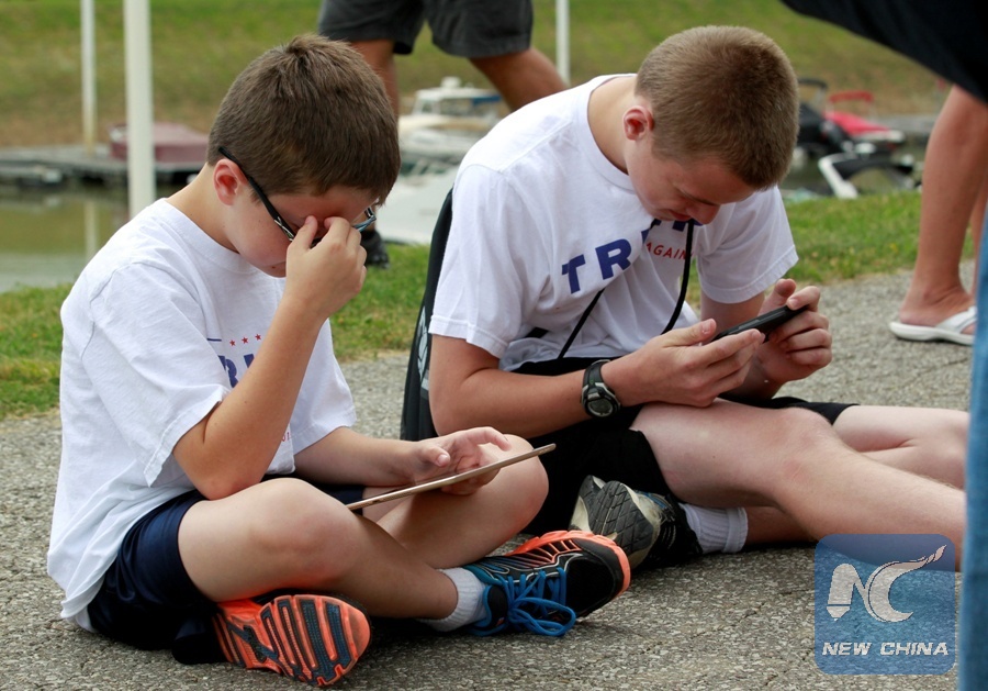 Young supporter of U.S. President Donald Trump play games on their IPad and IPhone as they wait in line before a rally at the Rivertown Marina in Cincinnati, Ohio, U.S. June 7, 2017. (Xinhua/REUTERS)