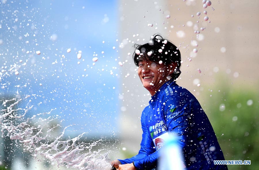 Li Zisen, from China's Qinghai Tianyoude Cycling Team (TYD) celebrates after taking the blue jersey that represents the best Asian rider in northwest China's Qinghai Province on July 22, 2018 (Xinhuanet Photo by Yang Shoude)
