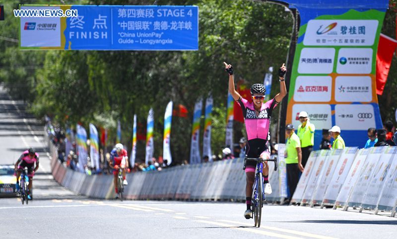 Hernan Ricardo Aguirre from Colombian Manzana Postobon Team (MZN) wins the fourth stage of the Tour of Qinghai Lake in northwest China's Qinghai Province, on July 25, 2018. (Xinhuanet Photo by Yang Shoude)