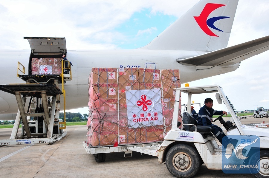 The aid, carried by a Boeing-747 cargo plane of China Eastern Airlines, includes 100 boats, 500 tents and 100 water clarifiers.