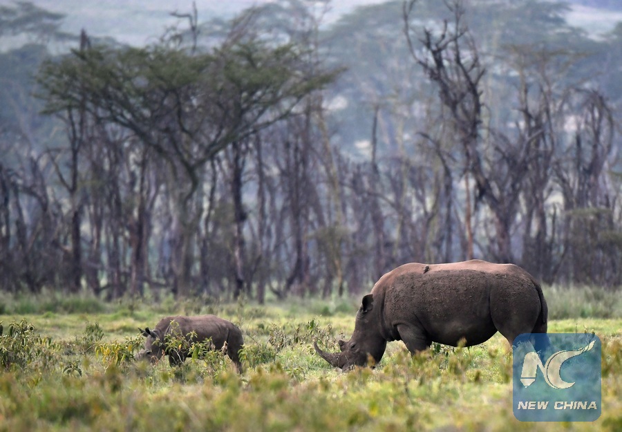 Photo taken on June 20, 2017 shows black rhinos in the Lake Nakuru National Park, Kenya. Lake Nakuru lies to the south of Nakuru, in the rift valley of Kenya and is protected by Lake Nakuru National Park. The lake's abundance of algae attracts a vast quantity of flamingos that famously lined the shore. Other birds also flourish in the area, as do warthogs, baboons and other large mammals. Eastern black rhinos and southern white rhinos have also been introduced. (Xinhua/Chen Cheng)