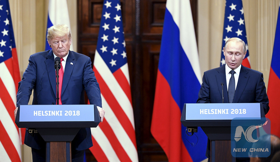 U.S. President Donald Trump (L) and Russian President Vladimir Putin attend a joint press conference in Helsinki, Finland, on July 16, 2018. (Xinhua/Lehtikuva/Jussi Nukari)