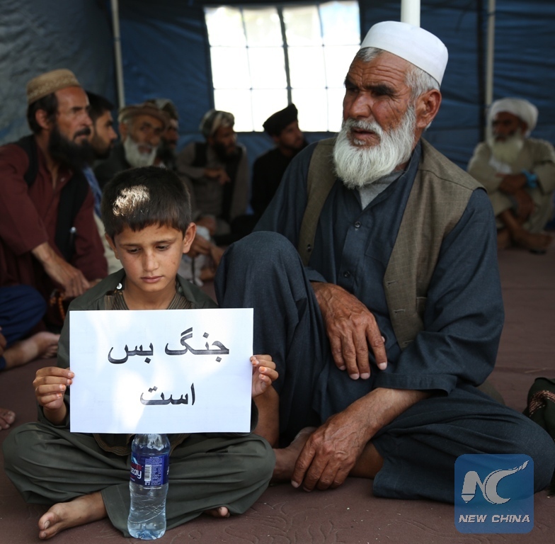 A boy holds a sign that reads "War is enough" during a rally calling for peace in Kabul, Afghanistan, July 19, 2018. (Xinhua/Rahmat Alizadah)