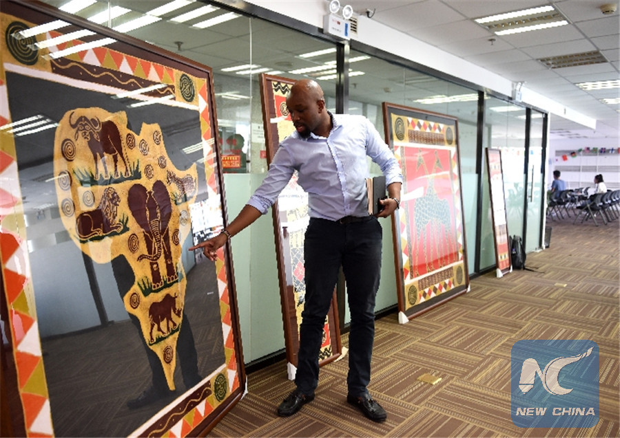 Edwin Mwenda introduces African art in his office in Beijing.