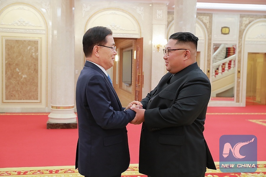 Chung Eui-yong (L), top national security adviser of the Blue House of South Korea, meets with Kim Jong Un, top leader of the Democratic People's Republic of Korea (DPRK), in Pyongyang, DPRK, on Sept. 5, 2018. (Xinhua/South Korea Presidential Blue House)