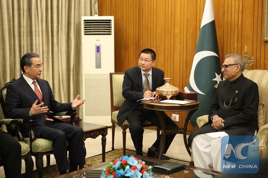 Pakistani President Arif Alvi meets with visiting Chinese State Councilor and Foreign Minister Wang Yi in Islamabad, Pakistan, on Sept. 9, 2018. (Xinhua/Liu Tian)