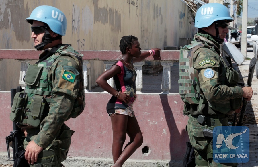 The file photo shows that a woman stands next to two Brazilian peacekeepers as they secure the perimeter of the Lycee Philippe Guerrier before the visit of UN Secretary General Ban Ki Moon after Hurricane Matthew in Les Cayes, Haiti, Oct. 15, 2016. (REUTERS Photo)