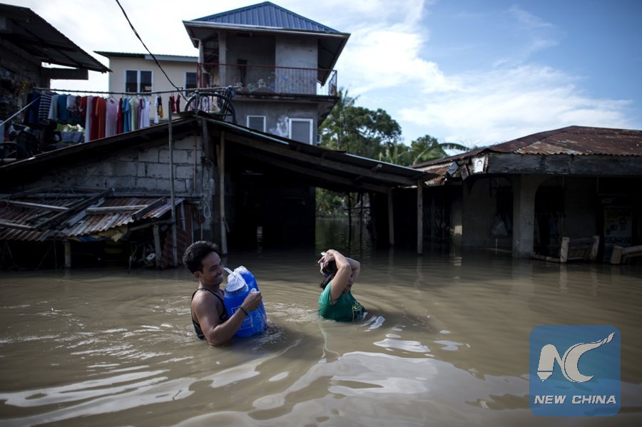 Residents wade through a flooded street in the aftermath of Typhoon Mangkhut in Calumpit, Bulacan, the Philippines on Sept. 17, 2018. (Xinhua/AFP)