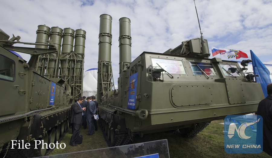 This file photo taken on August 27, 2013 shows S-300 air defense systems displayed at the Moscow International Aviation and Space Salon in Zhukovsky on the outskirts of Moscow, Russia. (Xinhua/AP)