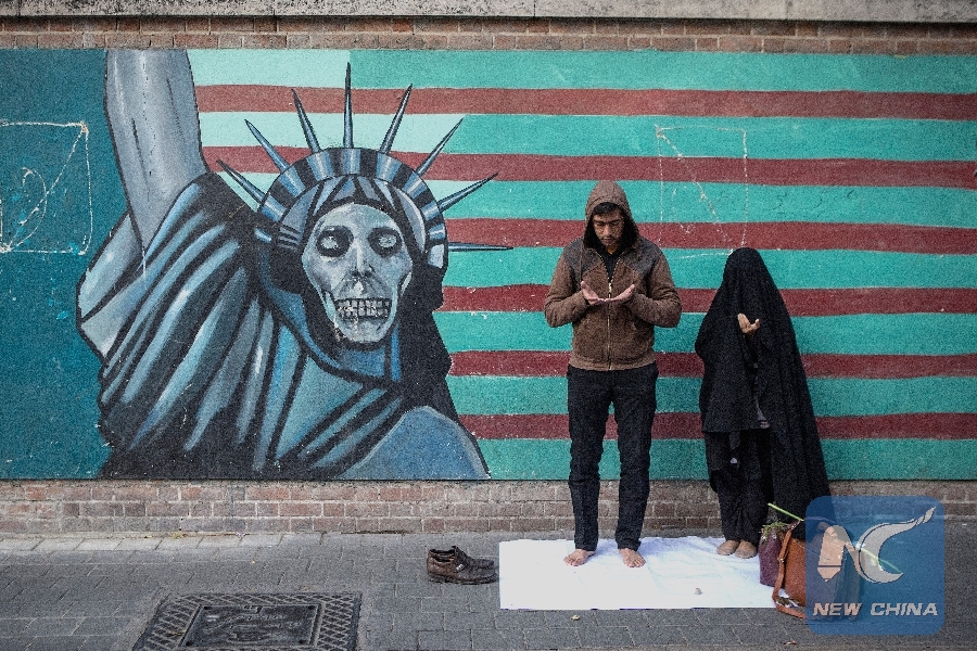 A couple pray after a rally marking the 39th anniversary of the seizure of the United States Embassy outside the former U.S. Embassy in Tehran, capital of Iran, on Nov. 4, 2018. (Xinhua/Ahmad Halabisaz)