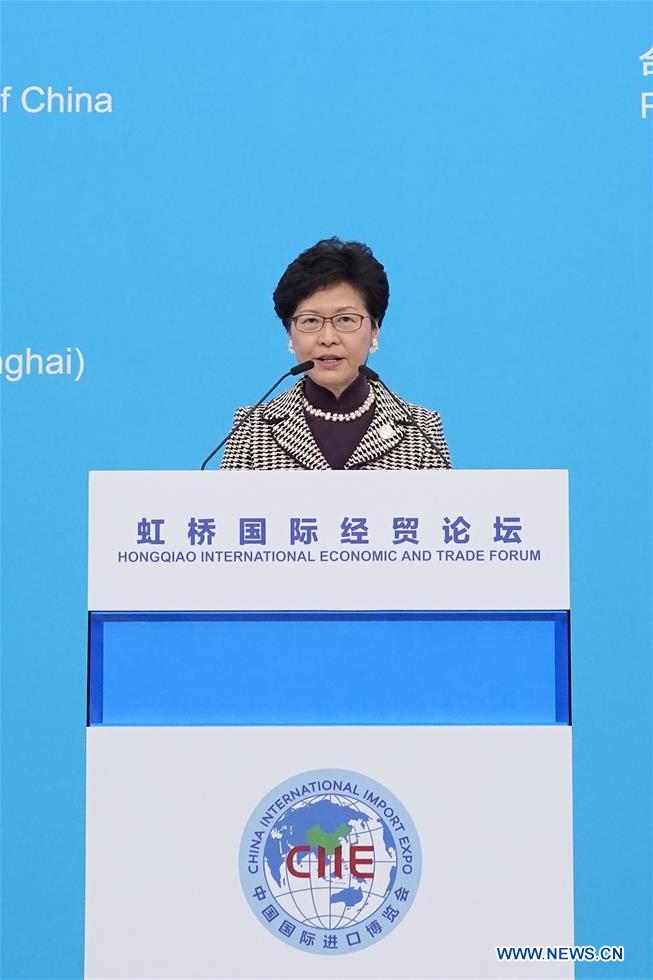 Carrie Lam Cheng Yuet-ngor, chief executive of China's Hong Kong Special Administrative Region, speaks at the Parallel Session on Trade and Innovation of the Hongqiao International Economic and Trade Forum in Shanghai, east China, Nov. 5, 2018.