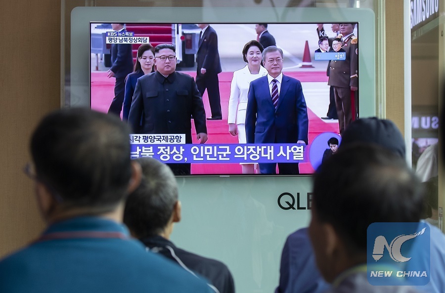 File Photo: Local residents watch a TV screen displaying top leader of the Democratic People's Republic of Korea (DPRK) Kim Jong Un receiving South Korean President Moon Jae-in at the Pyongyang International Airport for their third inter-Korean summit, at a station in Seoul, South Korea, Sept. 18, 2018. (Xinhua/Lee Sang-ho)