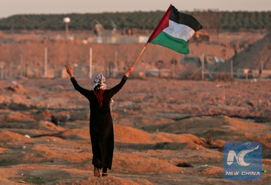 A Palestinian woman waves a national flag during clashes with Israeli forces in east of Gaza City near the Israeli border on Nov. 2, 2018. (AFP photo)