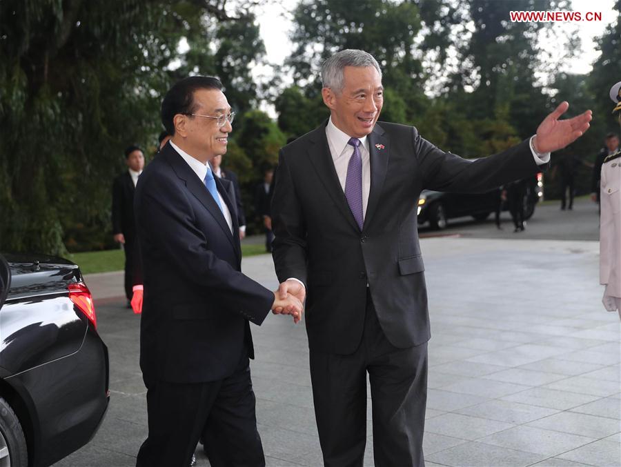 Chinese Premier Li Keqiang (L) attends a welcome ceremony held by Singaporean Prime Minister Lee Hsien Loong before their talks in Singapore, Nov. 12, 2018. (Xinhua/Liu Weibing)