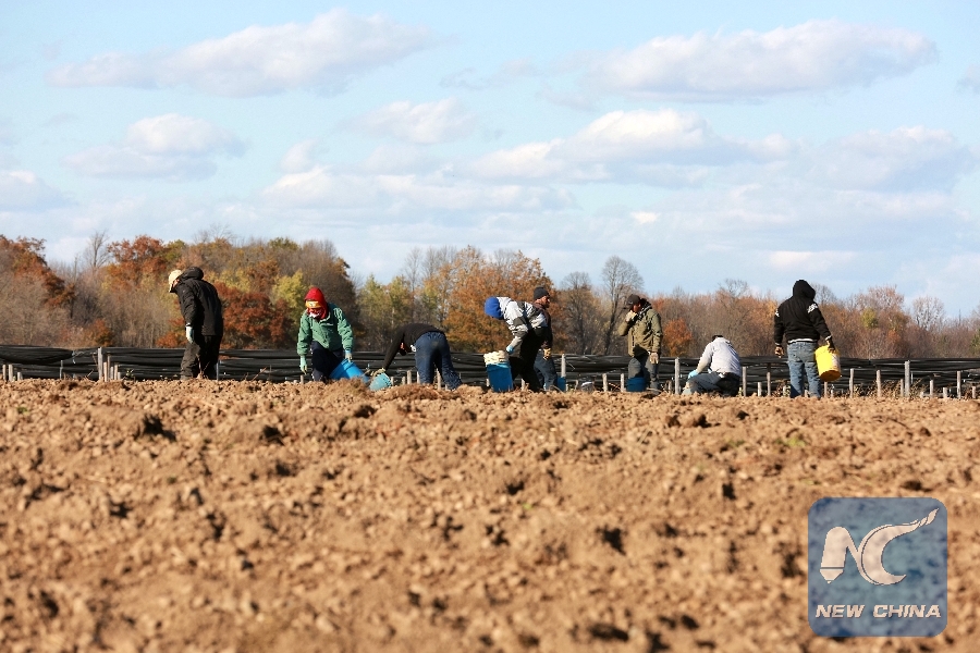 Local workers dig ginseng at a ginseng farm in Marathon County, Wisconsin, the United States, in this Oct. 22, 2018 file photo. (Xinhua/Wang Ping)