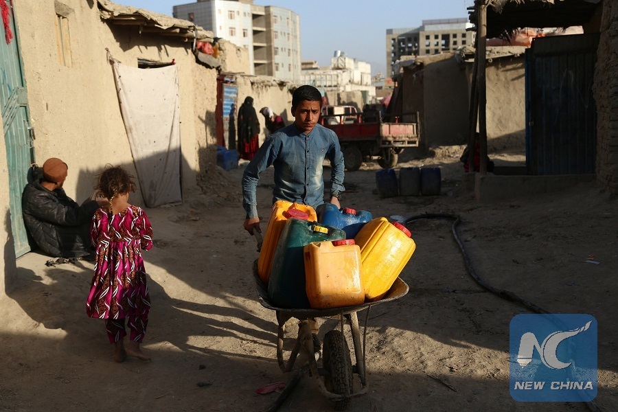 An Afghan youth pushes a hand cart at a displaced camp in Kabul, capital of Afghanistan, Oct. 22, 2018. (Xinhua/Sayed Mominzadah)