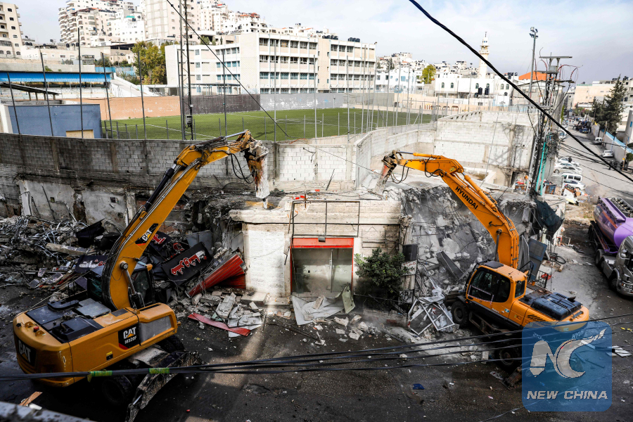 This picture taken on Nov. 21, 2018 shows two excavators of the Jerusalem municipality demolishing one of over a dozen shops in the Arab-inhabited Shuafat refugee camp in Israeli-annexed East Jerusalem. (AFP photo)