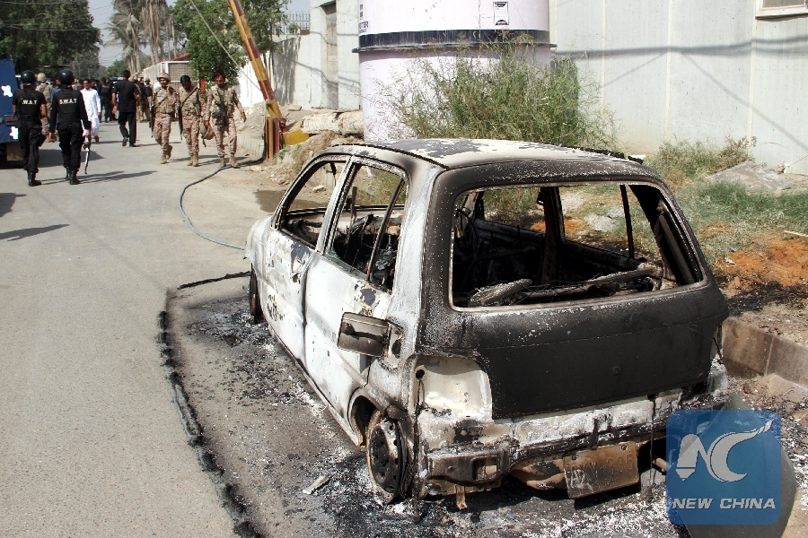 A burned out vehicle is seen at the attack site in Karachi, Pakistan, on Nov. 23, 2018. At least five people including two policemen were killed on Friday morning in a terrorist attack in the diplomatic area in Karachi, police and hospital officials said. (Xinhua/Stringer)