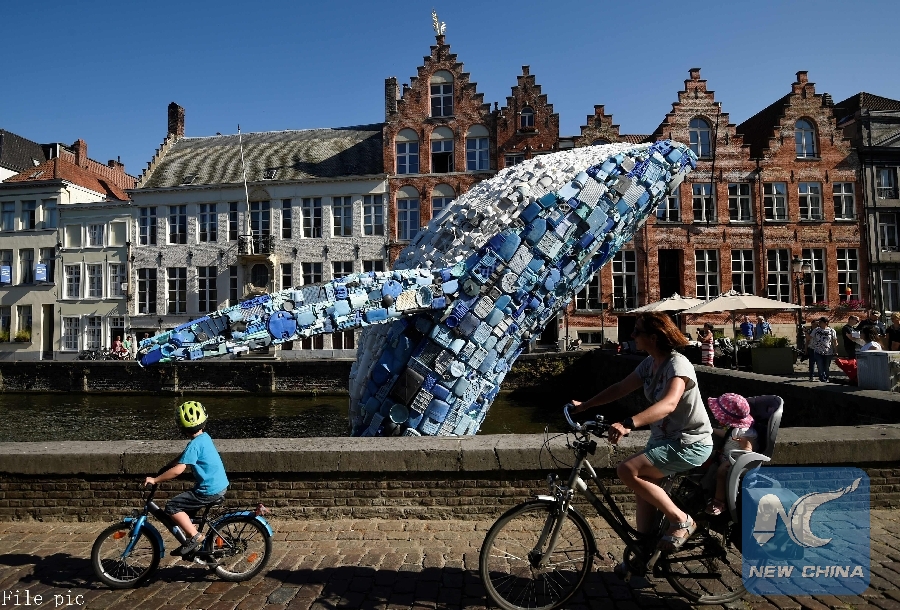 People ride past a 12-metre installation depicting a whale, made up of five tons of plastic waste pulled out of the Pacific Ocean, displayed in Brugges, on July 14, 2018 for the 2018 Bruges Triennial. (AFP photo)